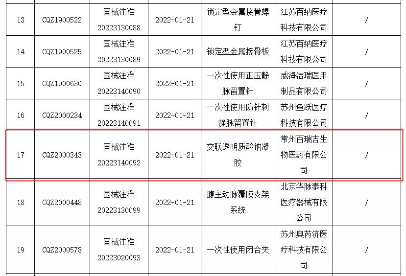 2022年1月26日,常州百瑞吉生物醫(yī)藥有限公司生產(chǎn)的產(chǎn)品“交聯(lián)透明質(zhì)酸鈉凝膠”獲NMPA批準上市(國械注準20223140092),產(chǎn)品用于預防盆腹腔術后粘連,恭喜百瑞吉產(chǎn)品獲得市場準入。