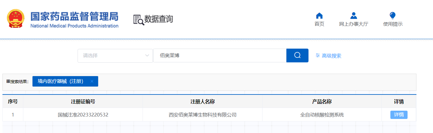 全自動核酸檢測系統(tǒng)獲證——2023年「第10張」三類醫(yī)療器械注冊證???2023年4月24日,經(jīng)國家藥品監(jiān)督管理局公示,西安佰奧萊博生物科技有限公司的“全自動核酸檢測系統(tǒng)”(國械注準(zhǔn)20233220532)獲得NMPA批準(zhǔn)上市,系2023年奧泰康助力獲得的第10張三類醫(yī)療器械注冊證。