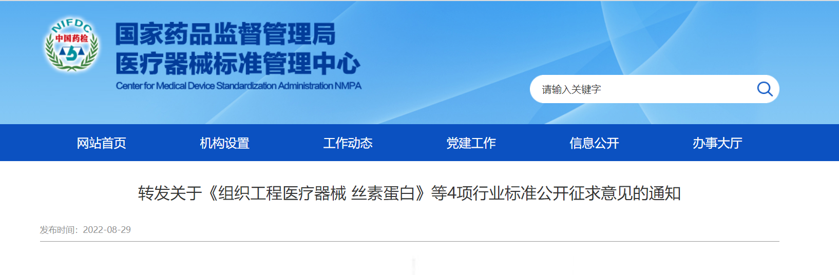 隨著絲素蛋白醫(yī)療器械產(chǎn)品的增加,對這一材料的生產(chǎn)制備、質(zhì)量控制等提出了要求。相對于產(chǎn)業(yè)的迅速發(fā)展,絲素蛋白相關標準在國際國內(nèi)仍處于空白。由于標準的缺乏,各絲素蛋白企業(yè)在企業(yè)標準制定過程中無統(tǒng)一的標準參考依據(jù),限制了絲素蛋白醫(yī)療產(chǎn)業(yè)的高質(zhì)量發(fā)展。目前,為提高絲素蛋白材料的質(zhì)量與安全性,為科學監(jiān)管提供支撐,由全國外科植入物和矯形器械標準化技術(shù)委員會組織工程醫(yī)療器械產(chǎn)品分技術(shù)委員會歸口的《組織工程醫(yī)療器械絲素蛋白》已形成征求意見稿[5],并于2022年8月23日-2022年10月24日期間公開征求意見。