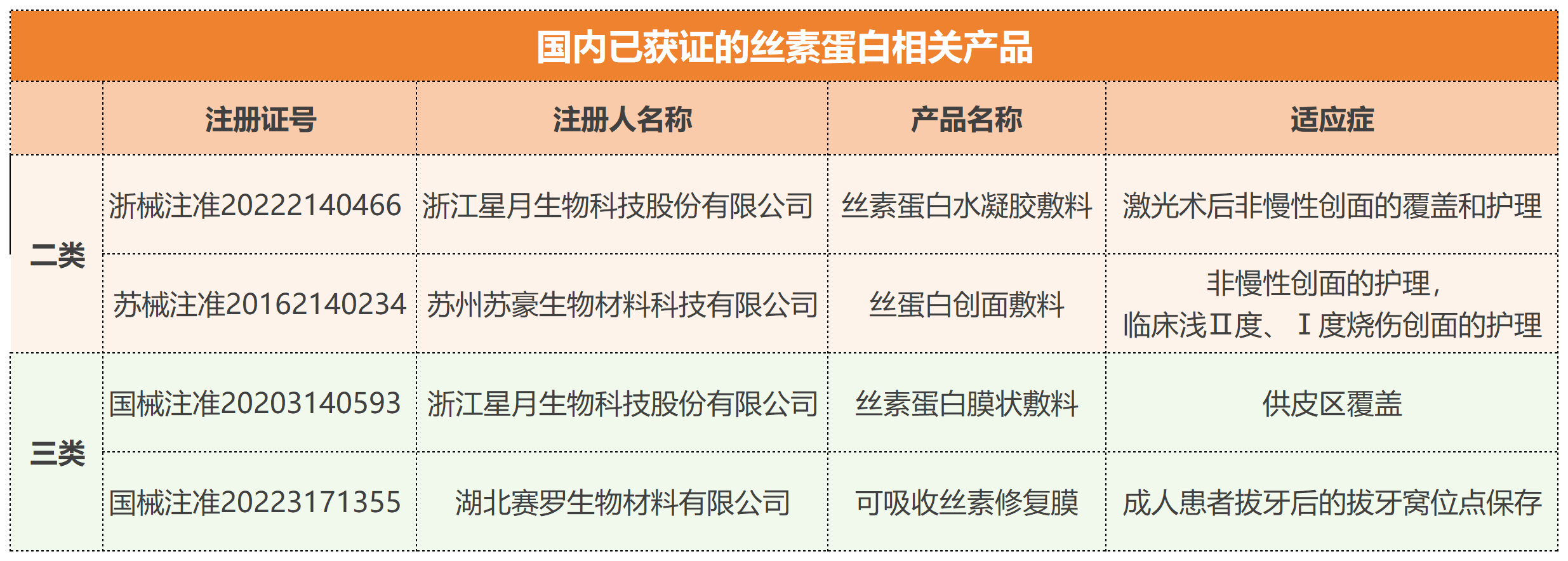 市面已對絲素蛋白制備的做了廣泛探究,目前成功商業(yè)化的產(chǎn)品不多(蠶絲縫合線、SERI外科支架、絲蛋白創(chuàng)面敷料、可吸收手術(shù)修復膜、Silk Voice®注射劑等),目前國內(nèi)共四款絲素蛋白產(chǎn)品獲批,其中僅一款為可吸收產(chǎn)品,說明市場仍具有巨大發(fā)展?jié)摿Α?/em>