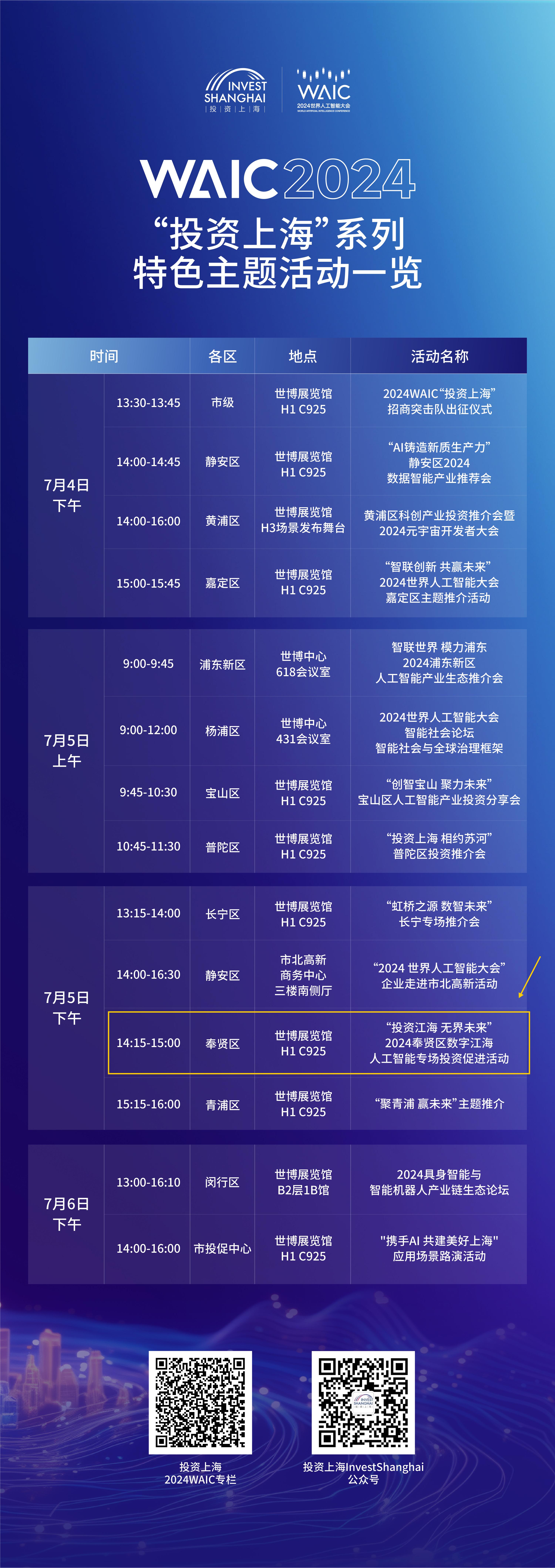 WAIC 2024是人工智能行業(yè)的世界盛會(huì),為把握大會(huì)激發(fā)的全新投資機(jī)遇,推動(dòng)展商變投資商,市投促中心聯(lián)合各區(qū)投促部門,將在大會(huì)期間舉辦一系列精彩紛呈的特色主題活動(dòng),向世界分享上海AI產(chǎn)業(yè)投資機(jī)遇。奧泰康受邀參加【“投資上海”系列特色主題活動(dòng)】,并在“投資江海 無界未來”2024奉賢區(qū)數(shù)字江海人工智能專場(chǎng)投資促進(jìn)活動(dòng)專場(chǎng)圍繞腦機(jī)接口領(lǐng)域展開主題分享,屆時(shí)將與醫(yī)療行業(yè)同仁共同交流,期待各位蒞臨現(xiàn)場(chǎng)。