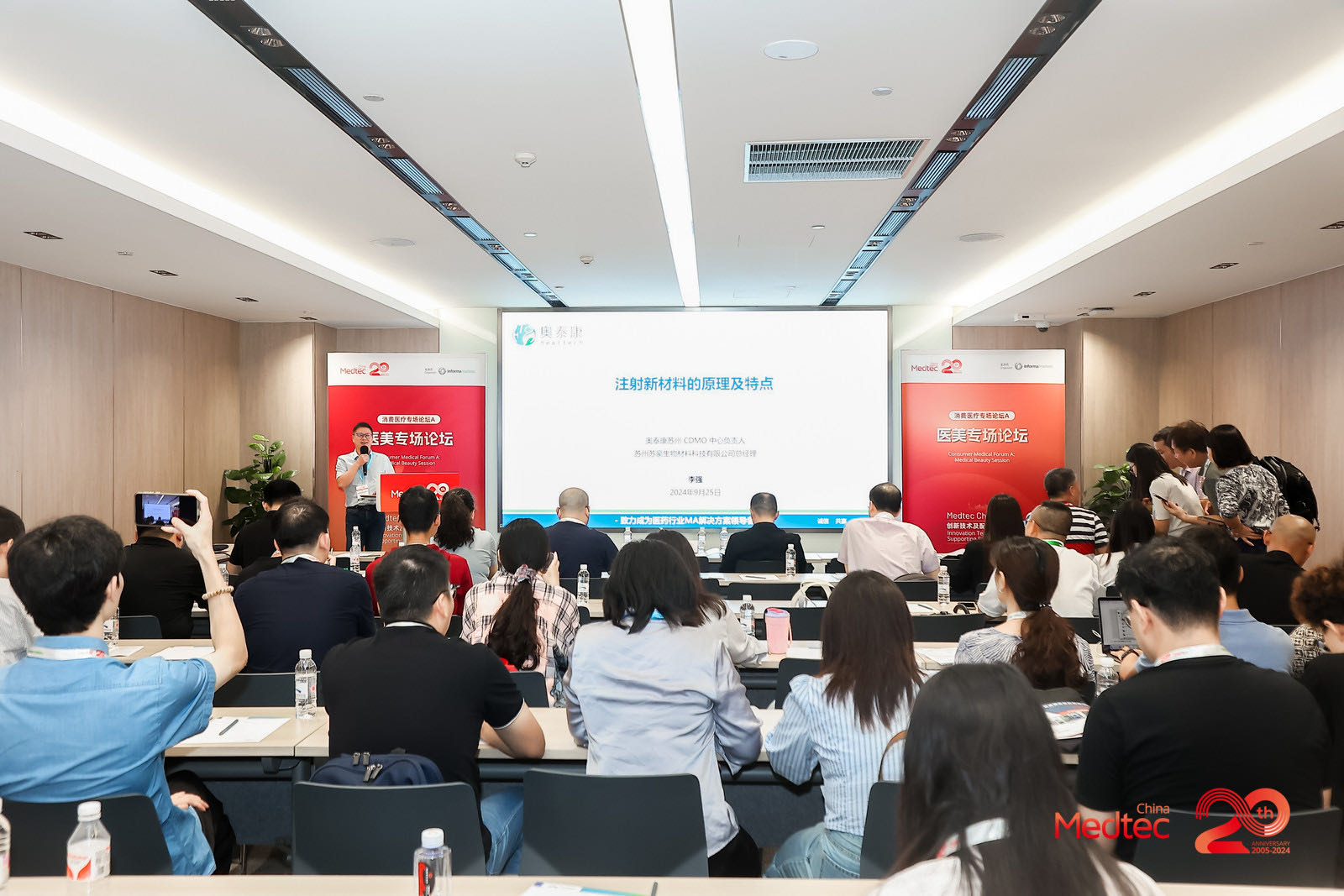 今年新增的消費(fèi)醫(yī)療專場論壇備受矚目,醫(yī)美專場論壇現(xiàn)場座無虛席。奧泰康蘇州CDMO中心負(fù)責(zé)人李強(qiáng)為與會者帶來了一場關(guān)于《注射新材料的原理及特點(diǎn)》的深度解析與前瞻分享,贏得參會者關(guān)注與認(rèn)可。他在分享中圍繞“注射類產(chǎn)品概況、注射新材料作用理及特點(diǎn)、絲素蛋白材料簡介”等方面對注射類材料進(jìn)行闡述,他強(qiáng)調(diào),注射新材料不僅要在生物相容性、機(jī)械強(qiáng)度、降解速率等方面滿足醫(yī)療器械的嚴(yán)格要求,還要具備易于加工、成本可控等實(shí)際應(yīng)用優(yōu)勢。在此基礎(chǔ)上,他詳細(xì)介紹了奧泰康CDMO中心在再生醫(yī)學(xué)生物材料及注射新材料領(lǐng)域所取得的突破性成果,包括新型生物材料的研發(fā)、材料改性技術(shù)的創(chuàng)新等,這些成果為注射類產(chǎn)品的性能提升和臨床應(yīng)用提供了有力支撐。