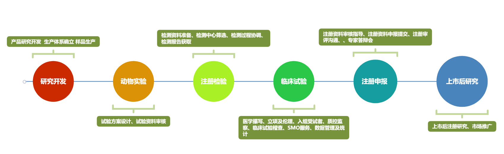 研究開發(fā)—?jiǎng)游飳?shí)驗(yàn)—注冊(cè)檢驗(yàn)—臨床試驗(yàn)—注冊(cè)申報(bào)—上市后研究