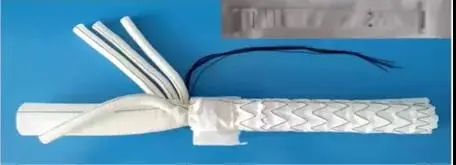 一體化免縫合帶支架人工血管系統(tǒng)包括人工血管和免縫合扣帶兩部分,通過主動脈覆膜支架進行腔內(nèi)修復(fù),一般由股動脈導(dǎo)入,到達病變部位后釋放支架,支架撐開后固定在主動脈內(nèi)壁,將病變血管覆蓋,重建安全通路,恢復(fù)血流循環(huán)。