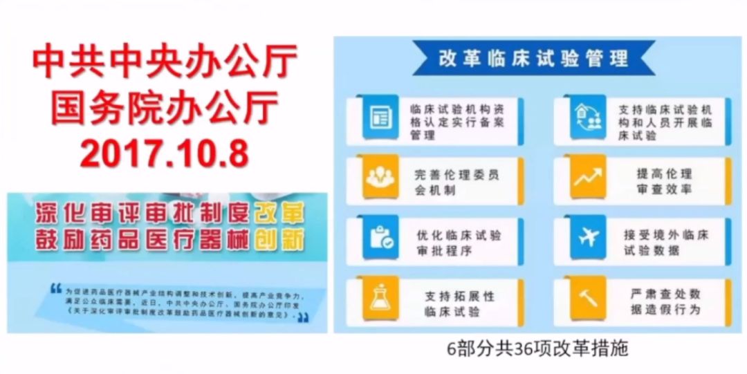 2017年10月8日,為鼓勵(lì)藥品醫(yī)療器械科技創(chuàng)新,提高上市產(chǎn)品質(zhì)量和產(chǎn)業(yè)競(jìng)爭(zhēng)力,滿足公眾臨床需要,中共中央辦公廳、國務(wù)院辦公廳印發(fā)了《關(guān)于深化審評(píng)審批制度改革鼓勵(lì)藥品醫(yī)療器械創(chuàng)新的意見》。在多方面深化了審批制度,包括改革臨床試驗(yàn)管理、加快上市審評(píng)審批、促進(jìn)藥品創(chuàng)新和仿制藥發(fā)展、加強(qiáng)藥品醫(yī)療器械全生命周期管理、提升技術(shù)支撐能力、加強(qiáng)組織實(shí)施等。