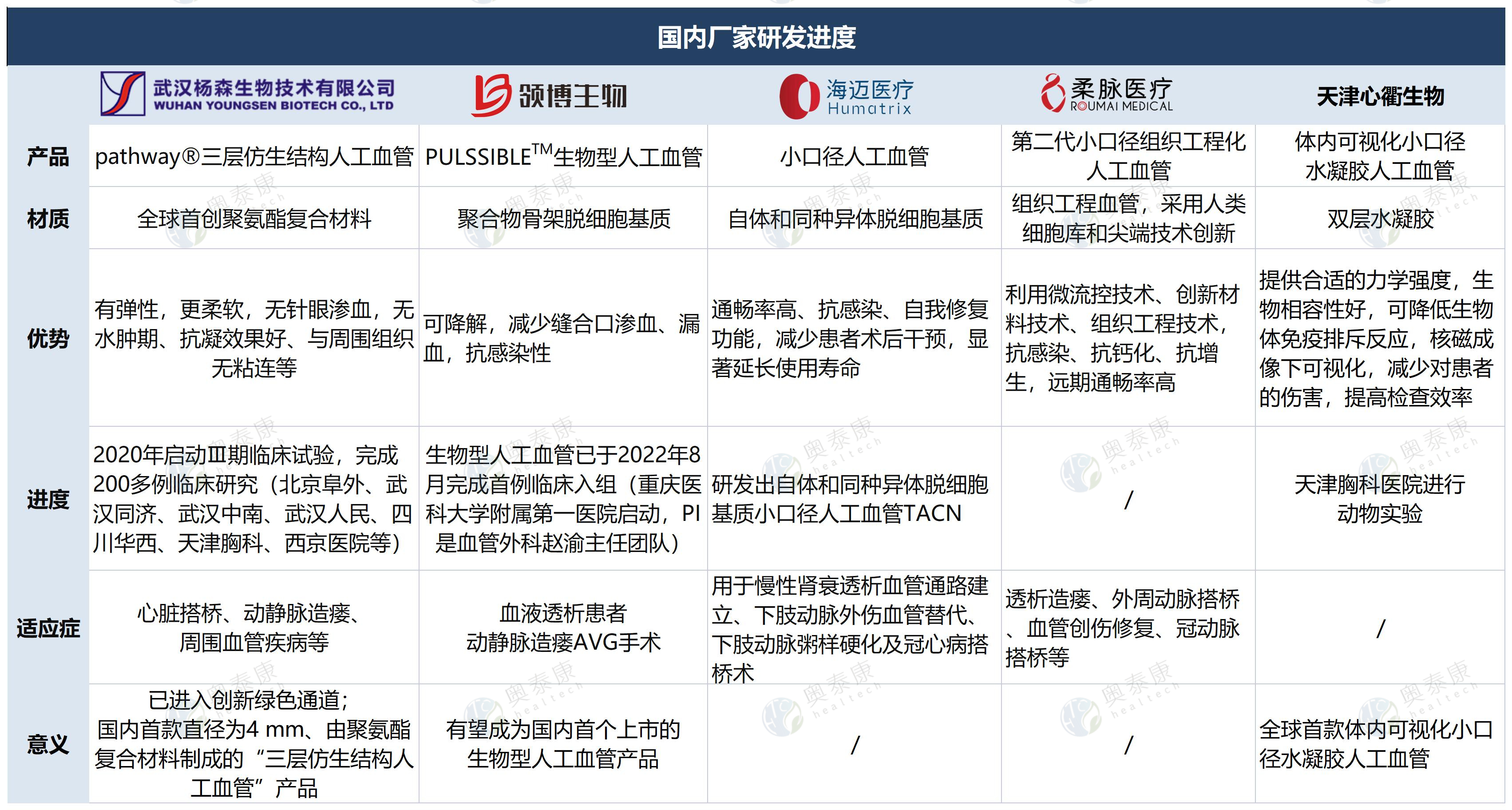 小口徑人工血管制造工藝流程復雜,周期長,投入大,技術壁壘較高,涉及材料工程、生物工程、醫(yī)學與紡織工程等多學科專業(yè)技術,目前國內僅少數(shù)企業(yè)布局研發(fā),主要有武漢楊森、杭州領博、蘇州海邁、深圳柔脈、天津心衢、上海生納、上海暢迪等。