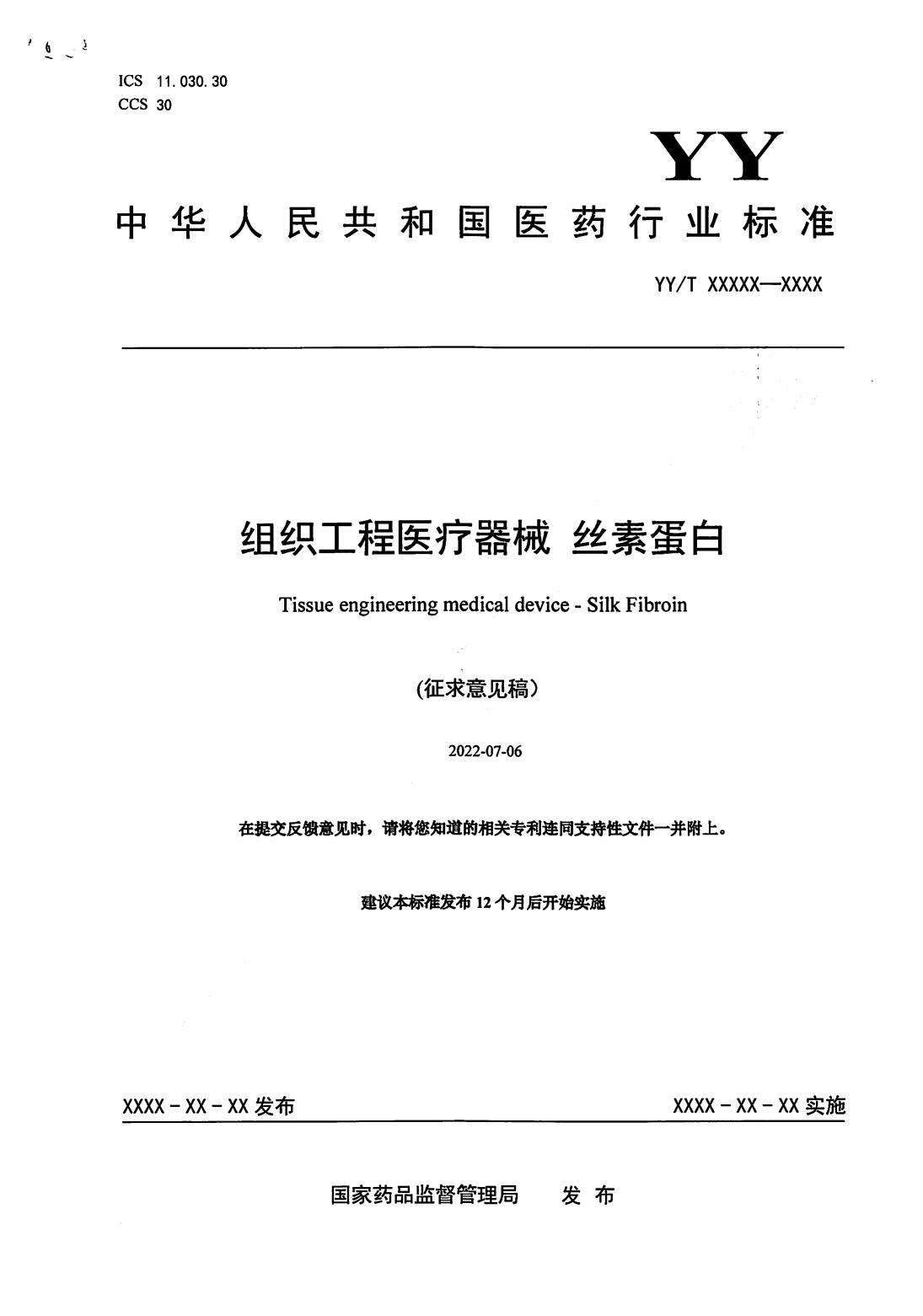隨著絲素蛋白醫(yī)療器械產(chǎn)品的增加,對這一材料的生產(chǎn)制備、質(zhì)量控制等提出了要求。相對于產(chǎn)業(yè)的迅速發(fā)展,絲素蛋白相關標準在國際國內(nèi)仍處于空白。由于標準的缺乏,各絲素蛋白企業(yè)在企業(yè)標準制定過程中無統(tǒng)一的標準參考依據(jù),限制了絲素蛋白醫(yī)療產(chǎn)業(yè)的高質(zhì)量發(fā)展。目前,為提高絲素蛋白材料的質(zhì)量與安全性,為科學監(jiān)管提供支撐,由全國外科植入物和矯形器械標準化技術(shù)委員會組織工程醫(yī)療器械產(chǎn)品分技術(shù)委員會歸口的《組織工程醫(yī)療器械絲素蛋白》已形成征求意見稿[5],并于2022年8月23日-2022年10月24日期間公開征求意見。