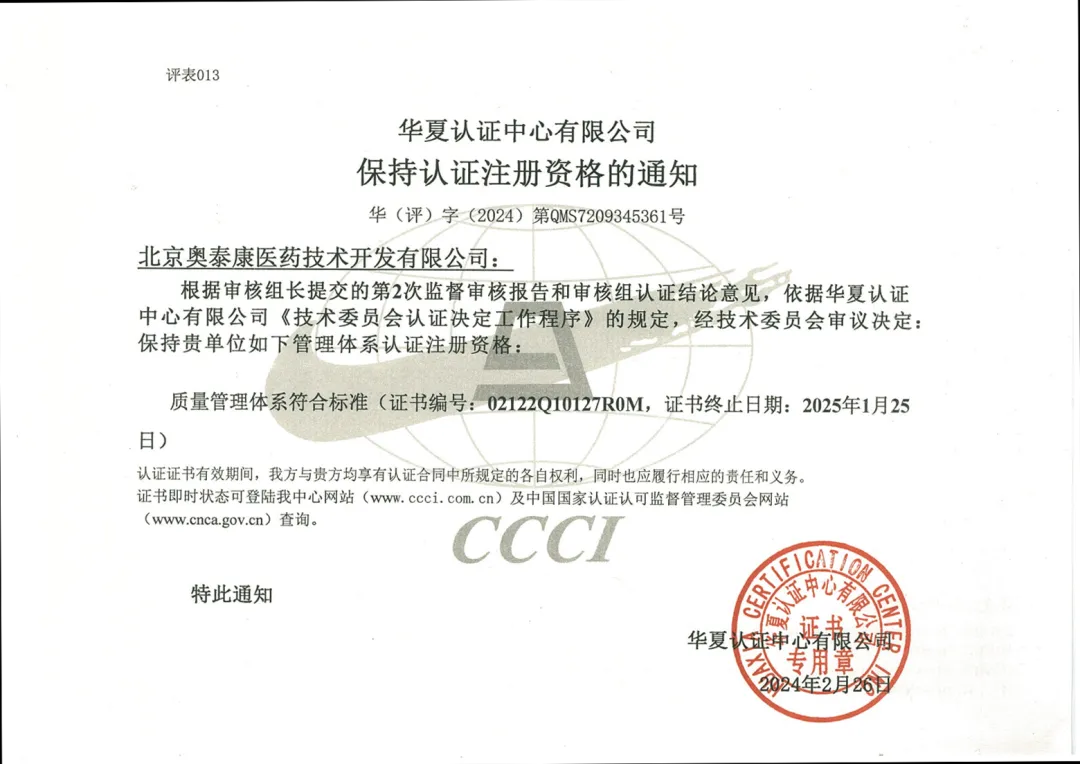 2024年3月,北京奧泰康醫(yī)藥技術(shù)開發(fā)有限公司經(jīng)華夏認(rèn)證中心有限公司(CCCI)認(rèn)證,順利通過ISO9001:2015 標(biāo)準(zhǔn)質(zhì)量管理體系認(rèn)證年度審核,認(rèn)證范圍為醫(yī)療器械臨床試驗及產(chǎn)品注冊服務(wù)。嚴(yán)格的質(zhì)量管理體系是企業(yè)持續(xù)、穩(wěn)定、健康發(fā)展的根本保證,通過ISO9001認(rèn)證標(biāo)志著我司的醫(yī)療器械臨床試驗及產(chǎn)品注冊服務(wù)與管理體系已達到了國際標(biāo)準(zhǔn)、行業(yè)標(biāo)準(zhǔn),在制度化、體系化和標(biāo)準(zhǔn)化方面取得了里程碑式的進展。